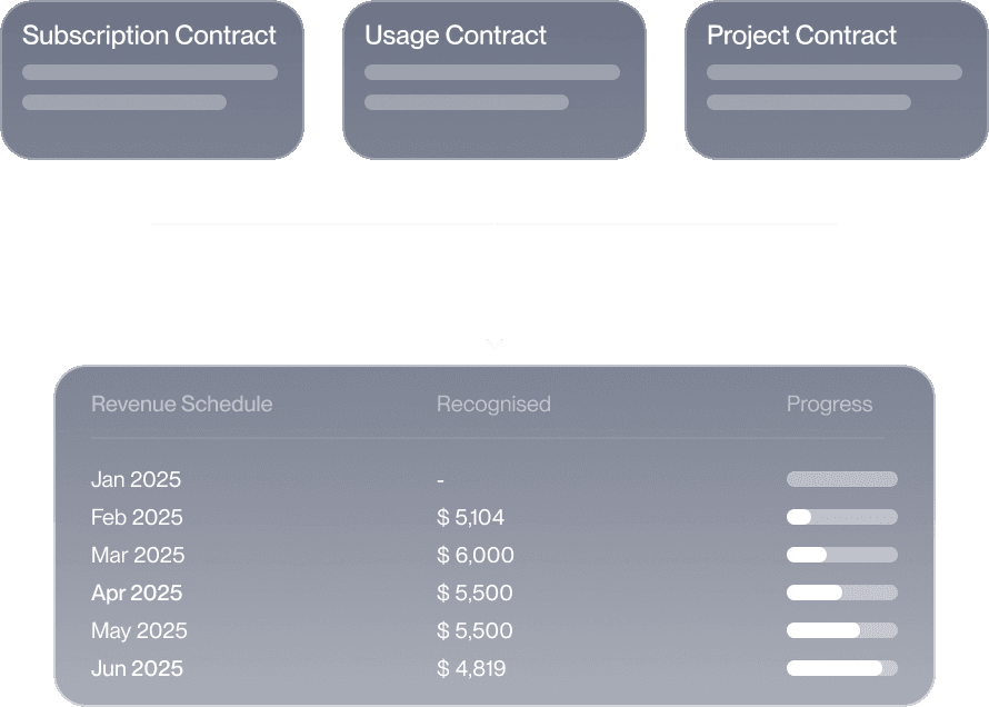 Subscription, usage, and project contracts convert into revenue schedules instantly.
